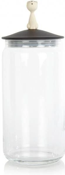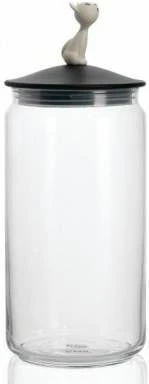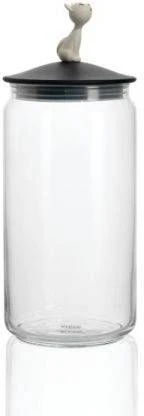 Alessi kattenvoederbewaarpot MiòJar met deksel, in thermoplastische hars en glas- De deksel is afgewerkt met een zittend katje-.