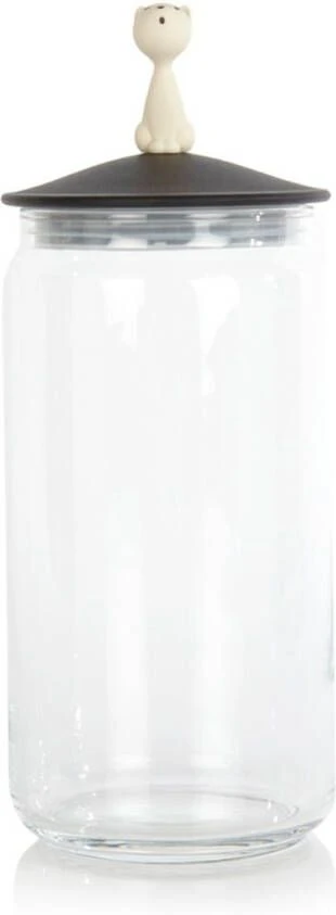 Alessi kattenvoederbewaarpot MiòJar met deksel, in thermoplastische hars en glas. De deksel is afgewerkt met een zittend katje.