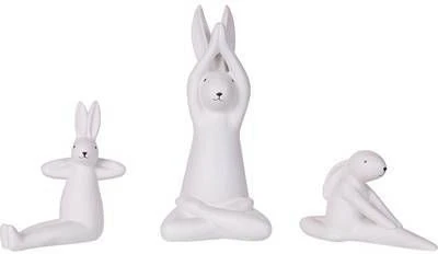 Drie decofiguren van witte konijnen.