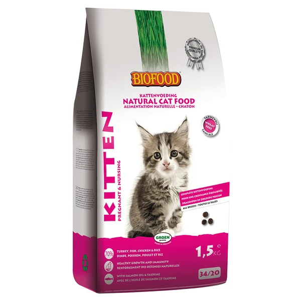 Biofood Kattenvoer KittenBiofood Kitten is hoogwaardige volledige natuurlijke kattenvoeding die speciaal ontwikkeld is voor kittens tot 12 maanden en zwangere en/of zogende katten. * 70% aan kalkoen, vis, kip en rijst. * Met prebiotica FOS (inuline), zalmolie met omega 3 en 6 vetzuren en taurine. * Voorziet in een verhoogde energiebehoefte * Hoge acceptatie en verteerbaarheid * Ondersteunt groei, ontwikkeling en afweer en zorgt voor een gezond skelet en gebit * Tarwevrij * Beperkt geur en volume van de ontlasting * Bevat geen kunstmatige toevoegingen.