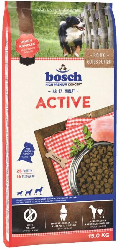 Bosch Active hondenvoer is een volledige hondenvoeding voor volwassen honden met een verhoogde energiebehoefte (waakhonden, sporthonden). Het bevat 25% vers gevogelte en is tarwevrij. Het voer draagt bij aan: