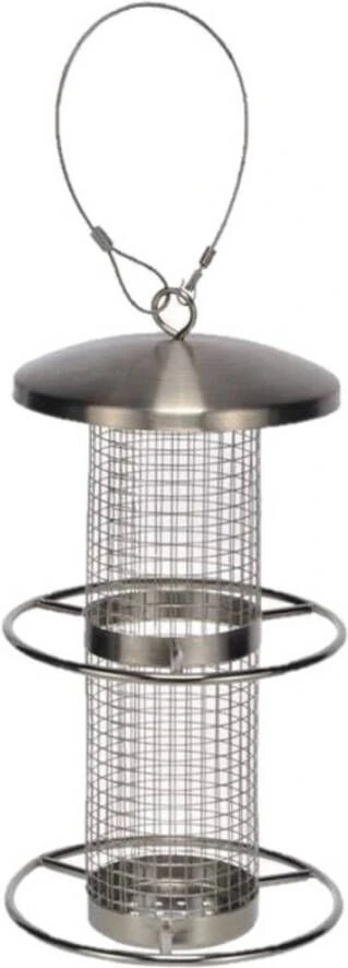RVS vogel voedersilo zilver 28 cm. Deze hangende vogelvoer silo voor vogelzaad heeft 2 ringen waar de vogels vanaf kunnen eten. Het vogelvoer is eenvoudig bij te vullen door de bovenkant van het voederstation los te halen. Geschikt voor he.