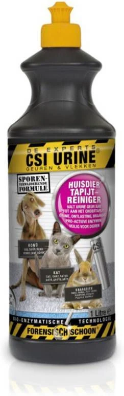 CSI Urine Tapijtreiniger verwijdert (oude) urinevlekken van huisdieren. Het reinigingsmiddel bevat enzymen en bacteriën om grondig te reinigen tot diep in de pollen. CSI Urine Tapijtreiniger is vrij van chemicaliën.