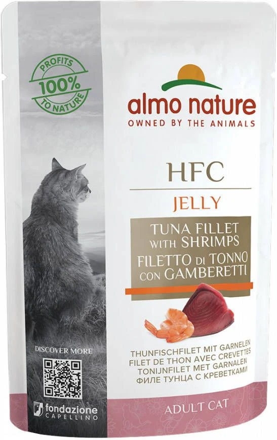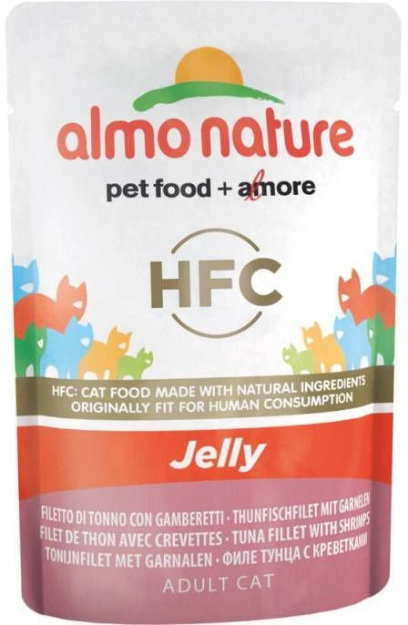 Almo Nature HFC Kat Jelly Pouch Tonijnfilet Garnalen 55 grDe HFC-recepten van Almo Nature zijn gemaakt met ingrediënten die oorspronkelijk geschikt waren voor menselijke consumptie maar in plaats daarvan zijn gebruikt in dit kattenvoer. Dankzij een duidelijke en transparante identificatie van de oorsprong van de ingrediënten, garandeert dit assortiment een natuurlijke en optimale voorziening van dierlijke eiwitten. Dit zorgt voor een goede voedingsbalans en draagt bij aan het mentale welzijn.HFC Jelly-recepten zijn samengesteld zonder chemische conserveringsmiddelen of kleurstoffen. Ze helpen bij het verwijderen van haarballen dankzij de plantaardige gelatine. * 100% HFC * Glutenvrij * Hoogwaardige eiwitten.
