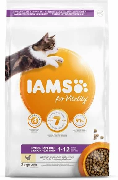 Iams Kat Kitten/Junior Kip 3 kgIams for Vitality met verse kip voor kittens is een 100% complete en uitgebalanceerde specialistische voeding om de gezondheid en vitaliteit van jouw kitten op 7 punten te ondersteunen, waaronder groei en ontwikkeling.