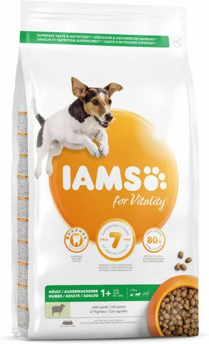 Iams Dog Adult Small Medium Lam 12 kgIams for Vitality voor volwassen honden van kleine en middelgrote rassen is een 100% complete en uitgebalanceerde specialistische voeding die de gezondheid en vitaliteit van jouw hond op 7 punten ondersteunt, waaronder zijn groei en ontwikkeling. Dit alles zit in een heerlijk recept met 80% dierlijke eiwitten (van het totale eiwitgehalte), waar jouw huisdier elke dag weer van kan genieten. * Voor honden van kleine en middelgrote rassen van 1 tot 8 jaar * 80% dierlijke eiwitten.