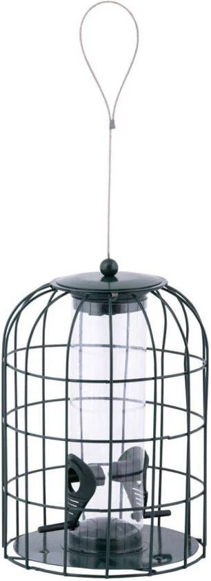 Vogel voedersilo/voederkooi 26 cm. Ongeveer 18 x 18 x 26 cm groot, excl. voer. Materiaal: metaal. Kleine vogels zoals Mezen kunnen zonder problemen door de mazen bij het voer komen.