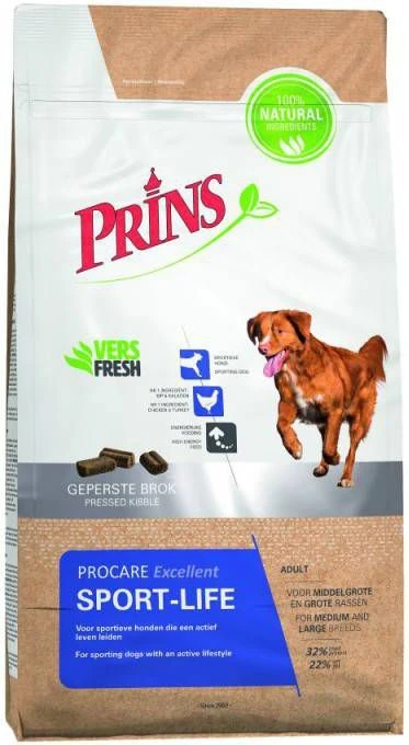 Prins Procare Sport-Life ExcellentDeze voeding is speciaal ontwikkeld voor sportieve honden die naast hun gebruikelijke dagelijkse beweging echt een paar keer per week flink sporten en topprestaties moeten leveren met een gemiddelde activiteitsduur.