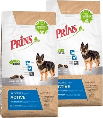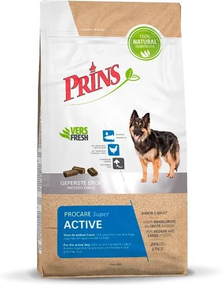 Prins ProCare Hond Super ACTIVE- Verkrijgbaar in 3kg,15kg en 20kg Prins ProCare Hond Super ACTIVE is een geperste voeding voor opgroeiende en actieve volwassen honden. Je hond blijft door deze voeding lekker actief en ondersteunt een goede conditie, gezonde huid en glanzende vacht. De essentële vetzuren in deze voeding zorgen voor voldoende energie ook bij drachtige en zogende honden.