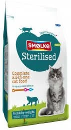 Smolke Sterilised voor gesteriliseerde en gecastreerde kattenDoor een ingreep veranderd de stofwisseling en wordt de voedingsbehoefte van de kat tot 30% lager, echter is er wel een neiging om meer te gaan eten. Dit kan resulteren in overgewicht. Smolke Sterilised is hier een goede oplossing voor.Smolke Sterilised bevat 20% minder vet dan de reguliere Smolke kattenbrokken. De extra natuurlijke vezels in de voeding zorgen voor een verzadigd gevoel en door de toevoeging van L-Carnitine en Choline wordt de vetverbranding extra gestimuleerd.De voordelen van Smolke sterilised: * Voorkomen en gaat overgewicht tegen * Geeft een verzadigd gevoel * Voorkomt tandplak * Biotine ondersteunt de huid en vacht * De extra vezels helpen haarballen voorkomen * Door middel van het eiwit DL-Methionine wordt de kans op nierstenen verkleint * Zonder kunstmatige kleur- geur- en smaakstoffen * Geen toegevoegde suikers.
