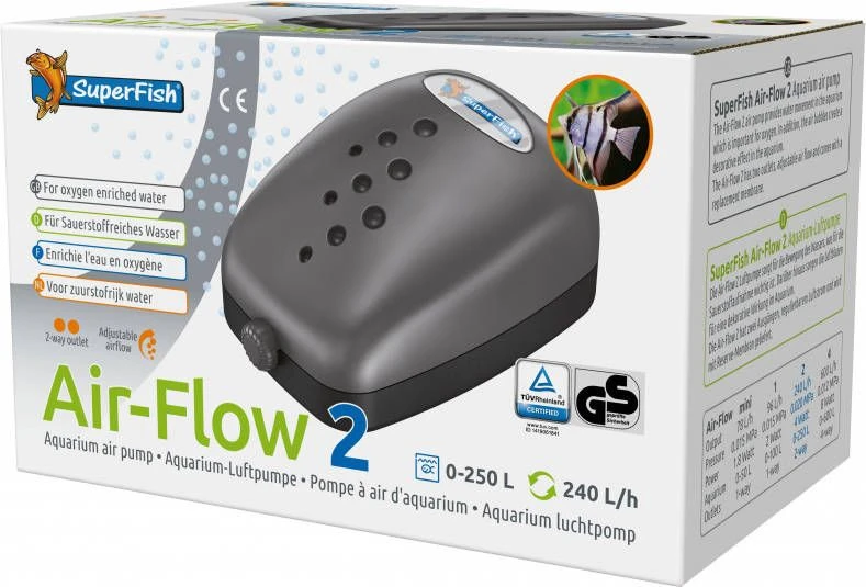 Een aquarium kan niet zonder zuurstof. De Air-Flow 2 Way van Superfish is een veilige luchtpomp voor in je aquarium en zal zorgen voor zuurstofrijk water. De luchtpomp wordt geleverd met een gratis vervangingsmembraam voor probleemloos en langdurig gebruik. De Air-Flow reeks heeft verschillende modellen met 1 tot 4 uitgangen zodat eventueel meerdere aquaria of decoratie ornamenten van lucht kunnen worden voorzien. De Air-Flow 2 Way heeft 2 uitgangen.