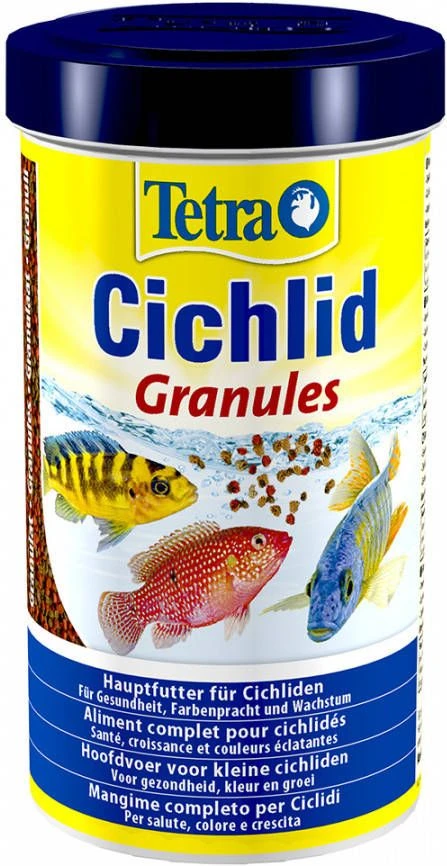 Tetra Cichliden Granulaat zijn twee verschillende soorten voeding voor cichliden. Die van 250 ml is voor kleine cichliden (mini granulaat), en die van 500 ml is voor grote cichliden (granulaat).