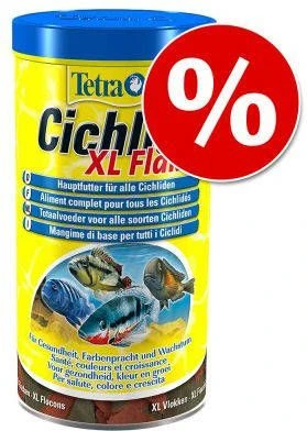 De Cichlid XL Flakes van Tetra zijn een hoofdvoeding voor alle soorten Cichliden en andere grote siervissen. Een voeding die opgebouwd is uit grote vlokken, afgestemd op de grootte van de bek. De voeding bevat een hoog gehalte aan dierlijke proteïnen en plantaardige voedingsstoffen. Deze mooie samenstelling voldoet aan de behoeften van cichliden. Het bevordert de natuurlijke kleur en weerstand van de vissen.