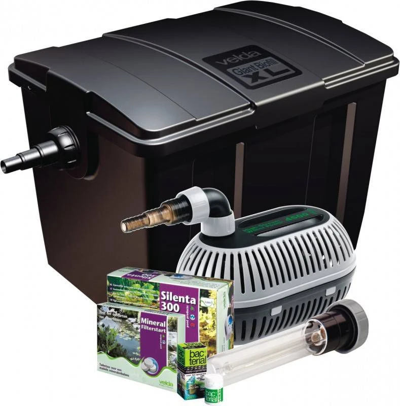 De Giant Biofill XL Set 15. De filtereenheid kan tijdens de winter op een vijver verwarmd worden. De vijverpomp Velda High Stream 15.000 behoort tot de beste vijverpompen wereldwijd. Door de hoge capaciteit is de vijverpomp bijzonder geschikt voor schuim effectfonteinen, stromen of watervallen. Met de bijgeleverde accessoires kunt u de High Stream 15. Levering bevat: 1 x Giant Biofill filter, 2 x UV-C unit 36 W, 1 x High Stream 15.000 pomp, 1 x Silenta Pro Air Generator Set 300, bio ballen, grove groene Japanse mat, fijne blauwe Japanse mat.