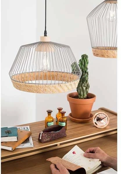De Birdy Wide hanglamp van Zuiver heeft een lampenkap gemaakt van ijzerdraad met een matte grijze kleur. Aan de onderkant van de kap vind je een rand van gevlochten rotan en aan de bovenkant een solide lamphouder van rubberhout. De lamp heeft een hoogte van 27 centimeter. Je gebruikt in de E27 fitting van Birdy Wide een normale lamp van maximaal 40 watt.